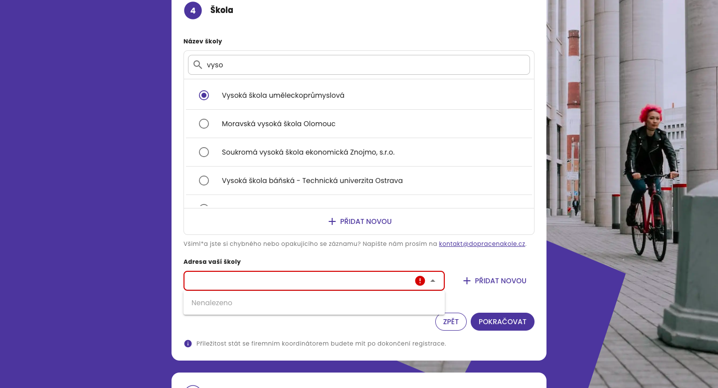 Created attachment 7 [details] je tam vidět NENALEZENO v míste, kde je potřeba, aby se objevila adresa školy Vybrala jsem v položce ÚČAST "spolužáky ze školy" a pak v dalším kroku Škola, jsem nenašla svoji školu a tak jsem si přidala novou, kde jsem vyplnila jeji název a i adresu. Pak je třeba vybrat adresu školy a bohužel to nijak nešlo, pořád píše Nenalezeno (viz. screenshot). Zkusila jsem si přidat svoji školu zas, ale pod jiným jmenem a opět to nešlo. Díky