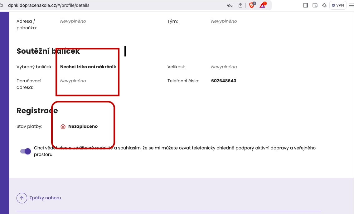 Created attachment 44 [details] V profilu nedokončené registrace nejde prokliknout možnost platby 1.V profilu nedokončené registrace nejde prokliknout možnost platby, pokud ji účastník nezvolil již při prvotní registraci. Tudíž stav je nezaplaceno, ale nejde to nijak změnit. viz prtscr. 2. Nejde změnit výběr trika Ani nejde doplnit doručovací adresa. viz prtscr. 3. Tým by měl jít také doplnit, což nejde.